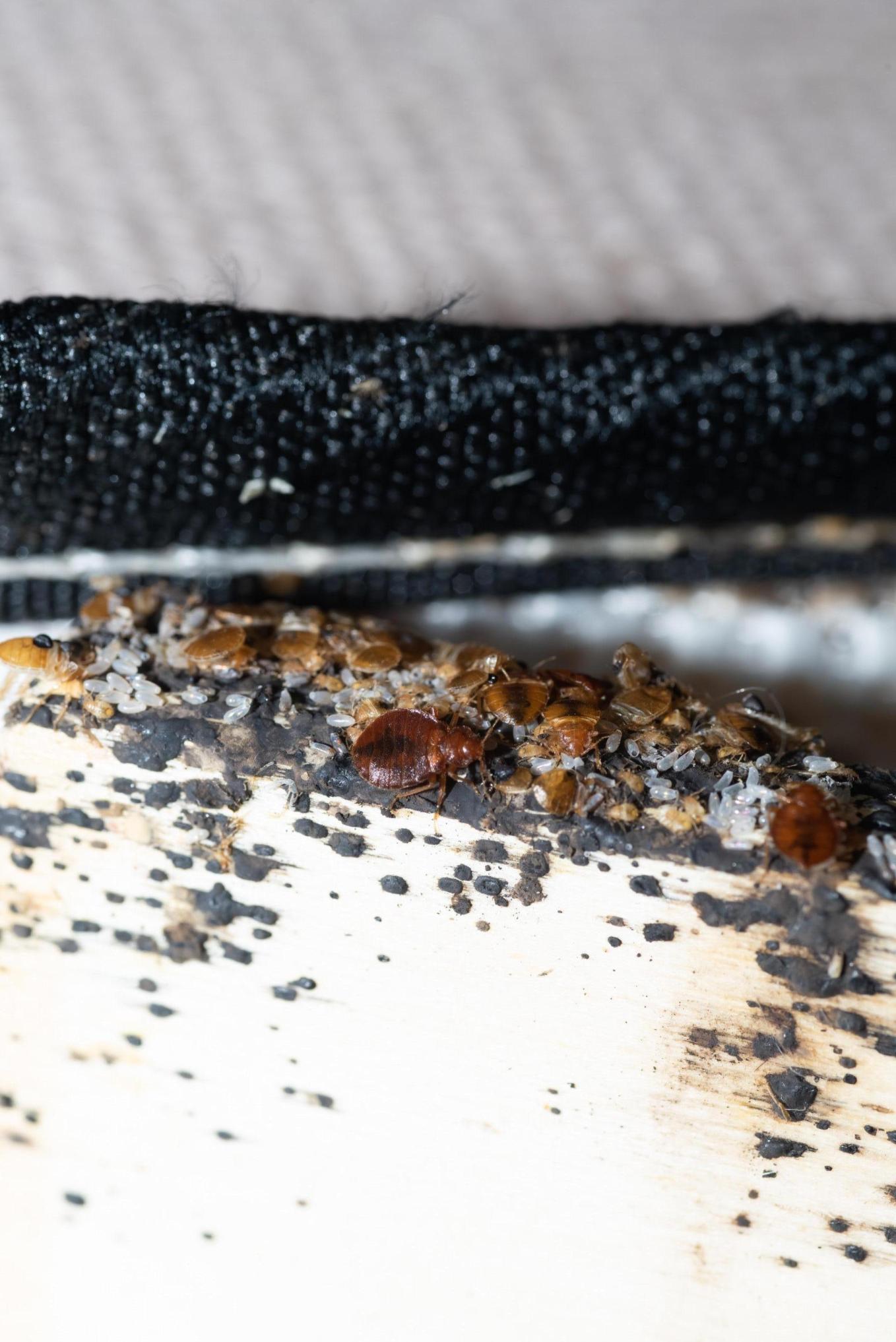 FIGURE 5. Bedbugs of all life stages, casings, frass, and eggs on the side of a mattress.
