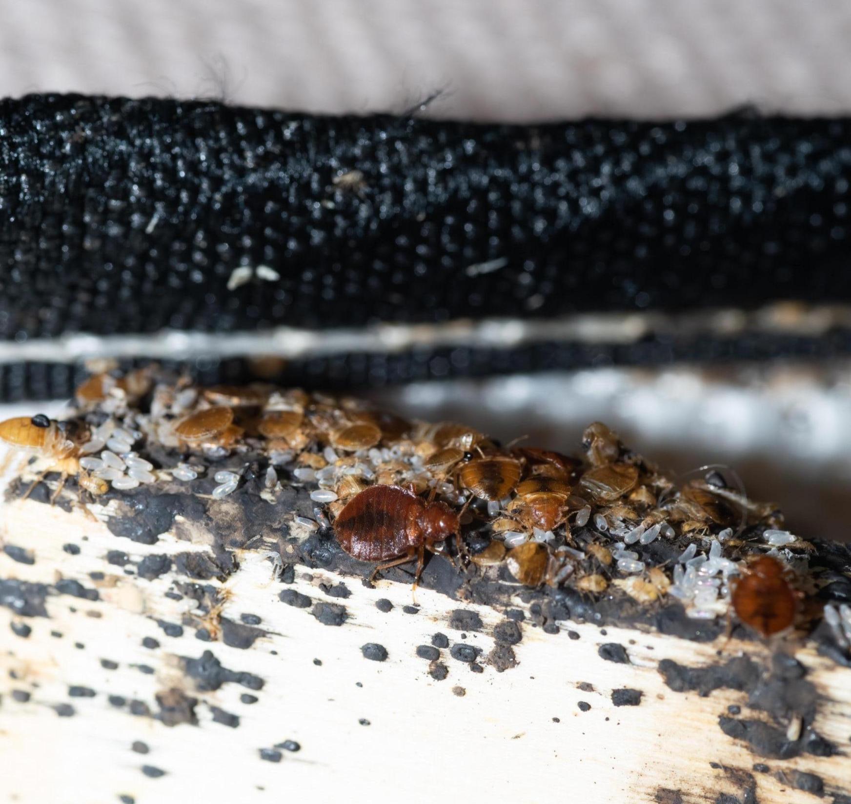 FIGURE 5. Bedbugs of all life stages, casings, frass, and eggs on the side of a mattress.