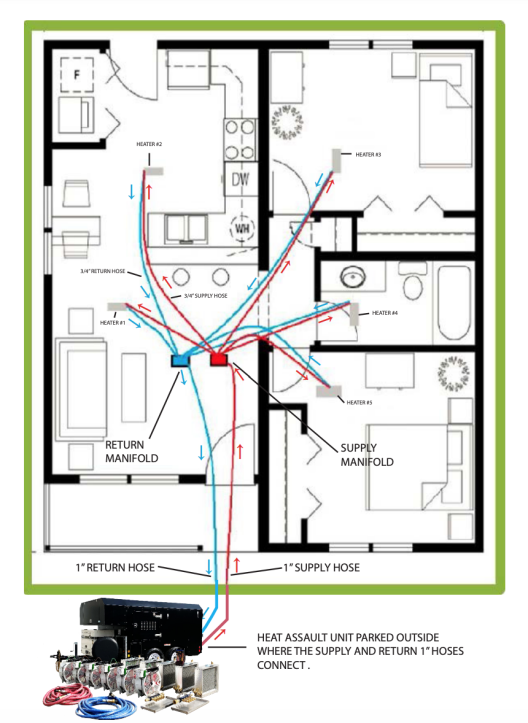 SET UP: On the morning of the treatment, set up takes about an hour. Hoses, heaters, and circulating fans are strategically placed throughout the designated areas to be treated (see Figure 1, below).